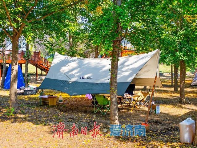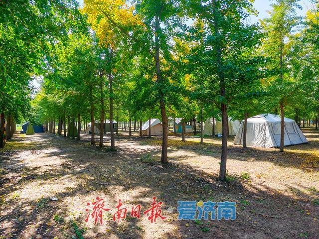 记者在位于济南黄河大坝附近的银杏林看到,昔日绿意盎然的树林已悄然变色。阳光透过枝叶的缝隙洒下,在地面形成斑驳的光影,为整个树林增添了温暖的氛围。与这静美的自然风光相映成趣的,是林间涌动的人潮和欢声笑语。树林的空地上,五颜六色的帐篷和天幕如雨后春笋般支起,三五好友围坐在一起,或品茶闲谈,或享受美食,构成了一幅充满烟火气的秋日休闲画卷。